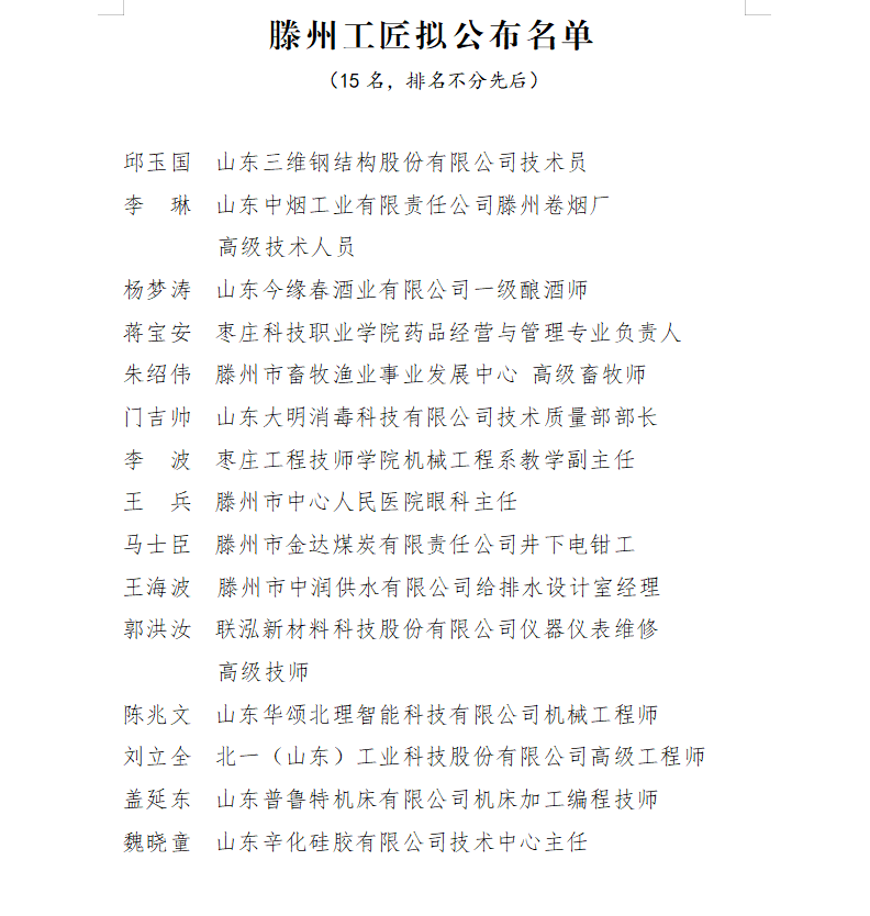 2024年,滕州市總工會開展了滕州工匠推薦培育工作。為充分發(fā)揚(yáng)民主,接受社會監(jiān)督,現(xiàn)將擬公布名單予以公示(排名不分先后),公示時間為2024年12月2日—6日(5個工作日)。如有不同意見,請于12月6日17時前,以電話或信函等方式實(shí)名向市總工會反映(信函以到達(dá)日郵戳為準(zhǔn))。反映問題要實(shí)事求是,電話和信函應(yīng)告知真實(shí)姓名和聯(lián)系方式,對線索不清的匿名電話和匿名信函不予受理。
