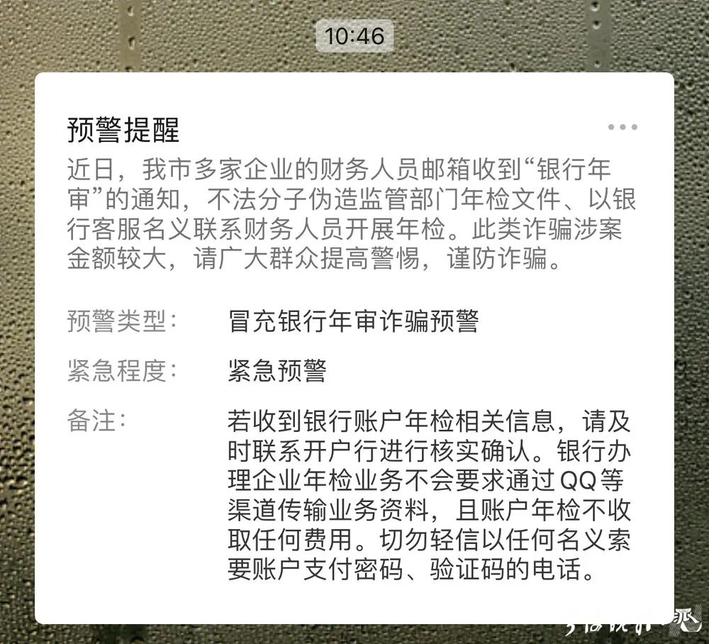 反詐提醒:若收到銀行賬戶年檢相關(guān)信息,請及時聯(lián)系開戶行進(jìn)行核實確認(rèn)。銀行辦理企業(yè)年檢業(yè)務(wù)不會要求通過QQ等渠道傳輸業(yè)務(wù)資料,且賬戶年檢不收取任何費用。建議企業(yè)提高防范意識,加強(qiáng)內(nèi)部人員溝通,切勿輕信以任何名義索要賬戶支付密碼、驗證碼的電話,一旦發(fā)現(xiàn)疑似詐騙或被騙,請及時撥打110或96110,準(zhǔn)確提供轉(zhuǎn)賬時間、金額、對方賬戶等信息,配合警方做好止損、取證等工作。