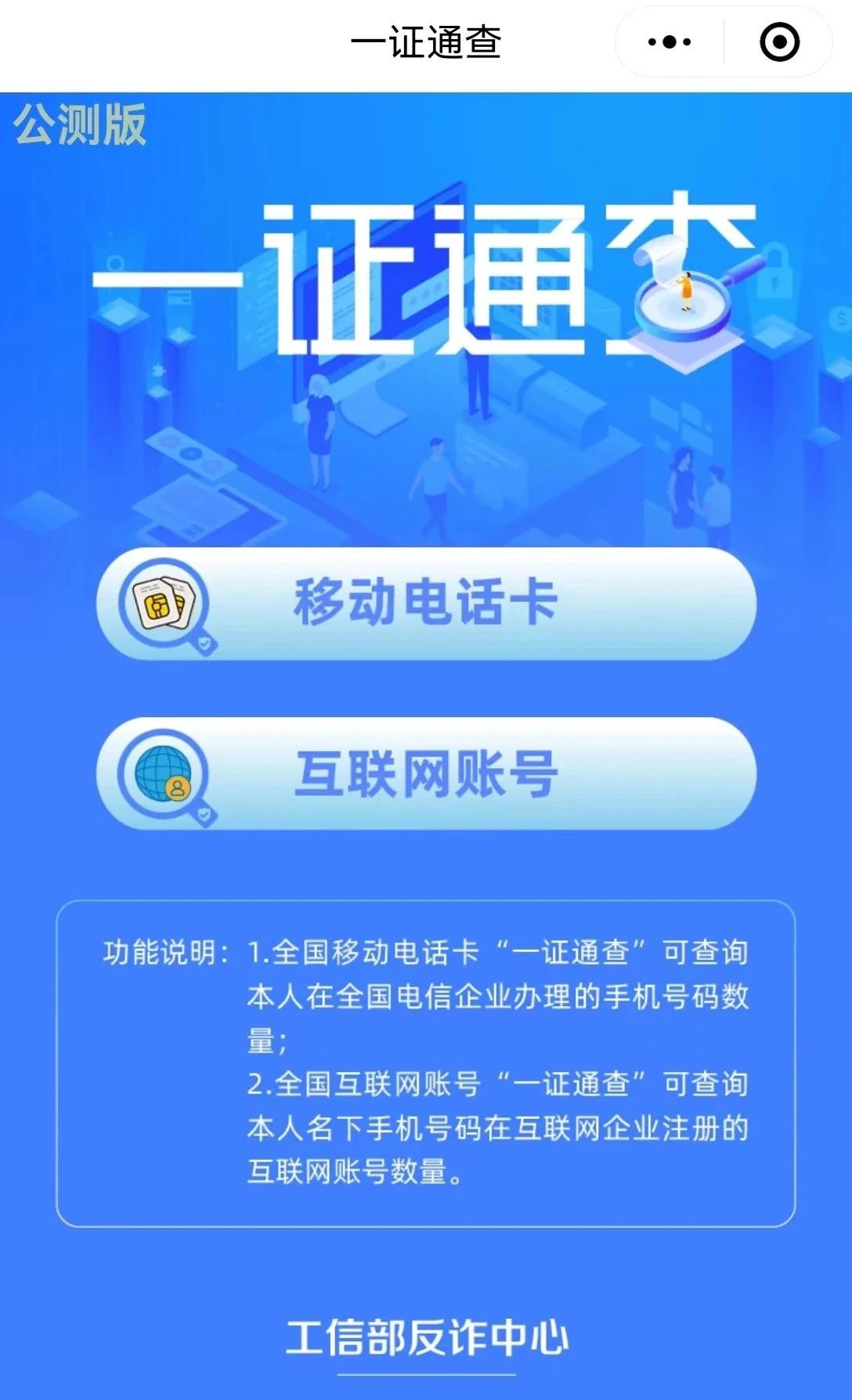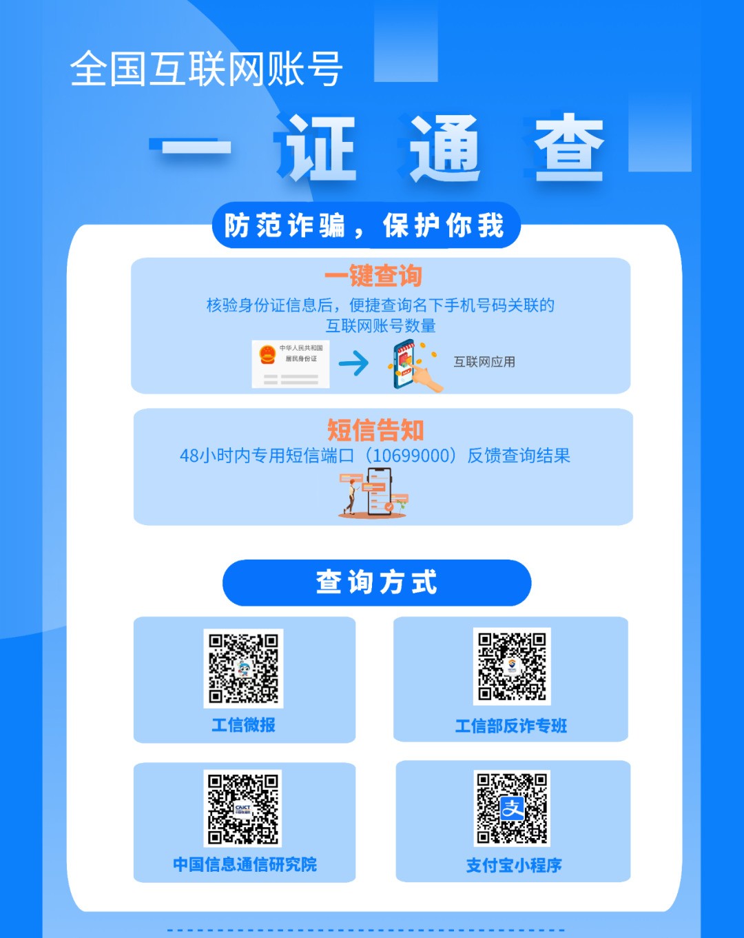 用戶可以通過工業(yè)和信息化部政務(wù)微信號“工信微報(bào)”和“工信部反詐專班” “中國信通院”微信公眾號,以及支付寶“一證通查”小程序等方式等進(jìn)入查詢?nèi)肟凇?/span>